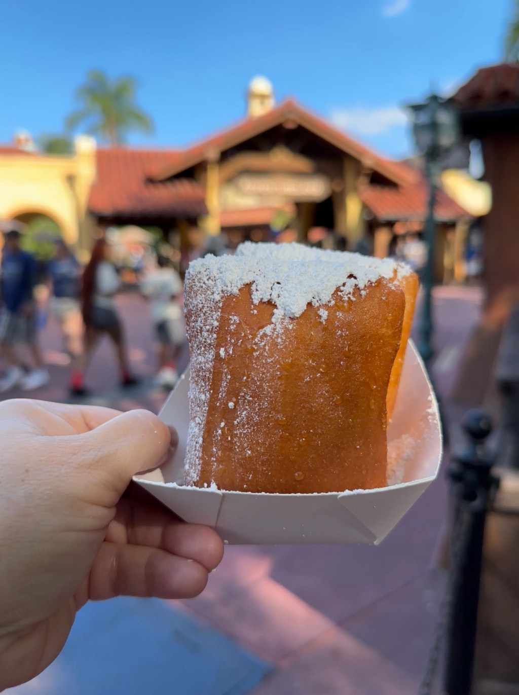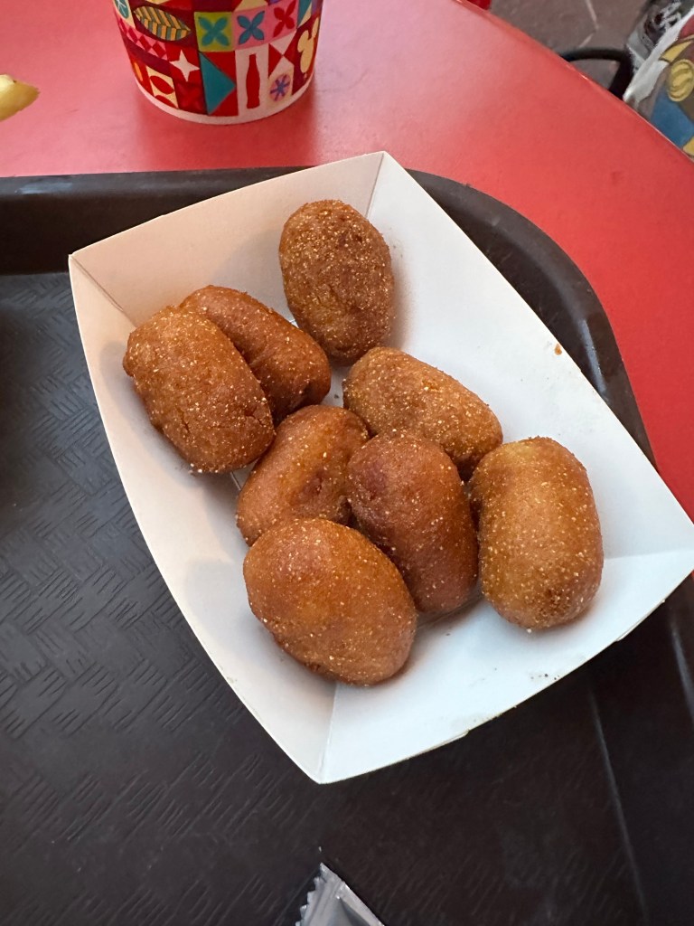 Our first stop was at the Golden Oak Outpost for Tiana’s Famous Beignets. I know I questioned the all American too but New Orleans is in the US. These beignets are yummy and a great addition to the sweet treats available. But they do not compare to the Mickey beignets at Scat Cat’s Club at Disney’s Port Orleans Resort – French Quarter. And it’s not just the magical shape. The beignets at the French Quarter resort are pillowy goodness with a choice of three dipping sauces chicory chocolate ganache, my favorite, salted caramel, also yummy, or strawberry. Not that these fried Mickey’s of goodness need a sauce, it just a bonus! The MK beignets are rectangular pockets with honey drizzled over them. Both types of beignets are covered in a healthy amount of sweet powdered sugar, but found myself missing the chewy dough in the center. As a sweet treat Tiana’s beignets will do the trick, but don’t expect the same level of goodness as the French Quarter Mickey version.