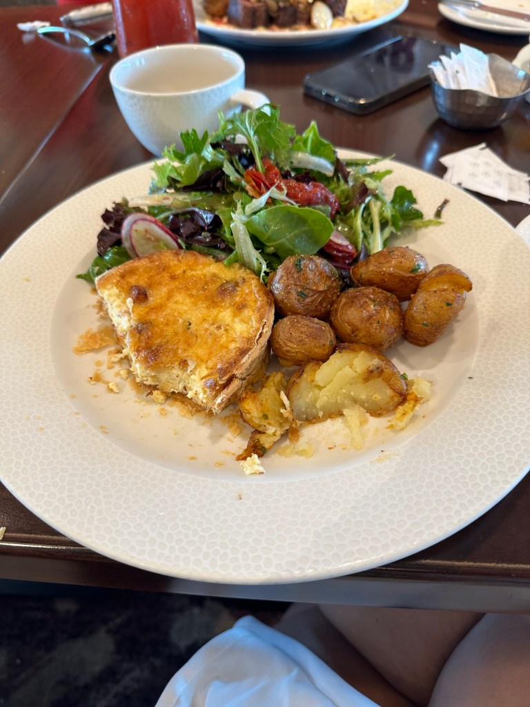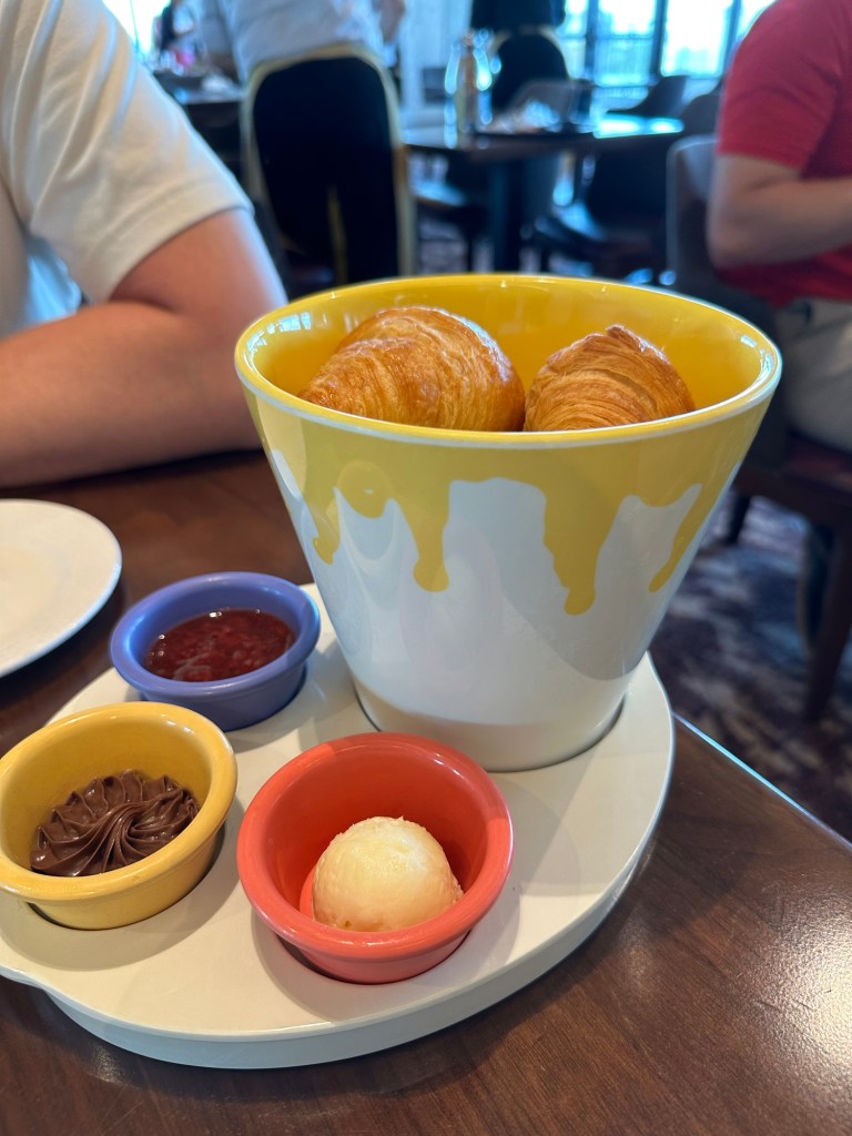 Next the food. It was delicious! You start off with an artist’s palette with croissants and mini-muffins along with butter, chocolate spread and a jelly. My favorite was the croissant with chocolate spread. Just yum! I chose the Quiche Gruyère and it was so good. I enjoyed every last bite. My husband got the Wood-Fired Steak and Eggs which was delish too. He also enjoyed a Zero-Proof Riviera Spicy Bloody Mary.