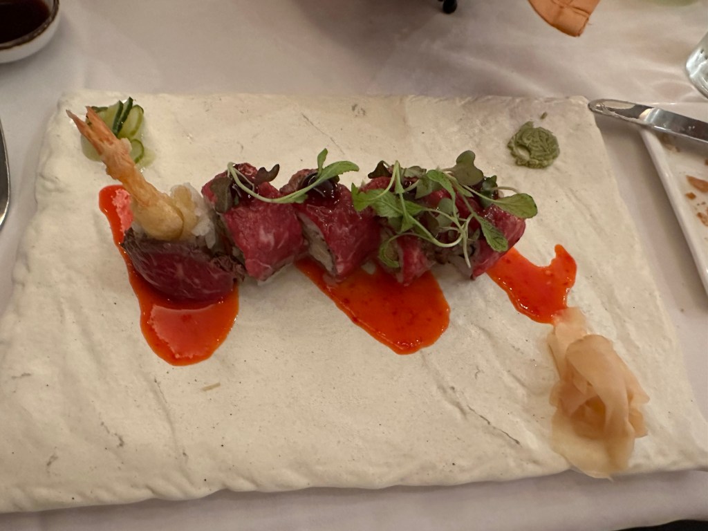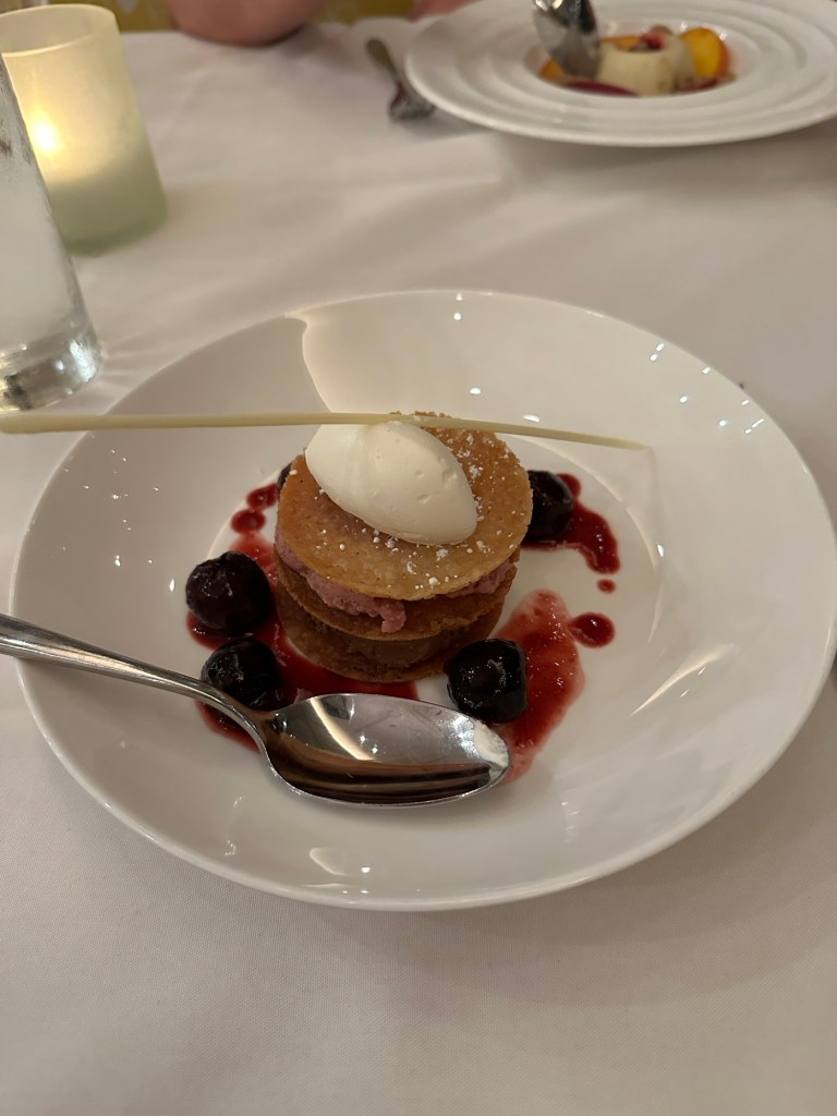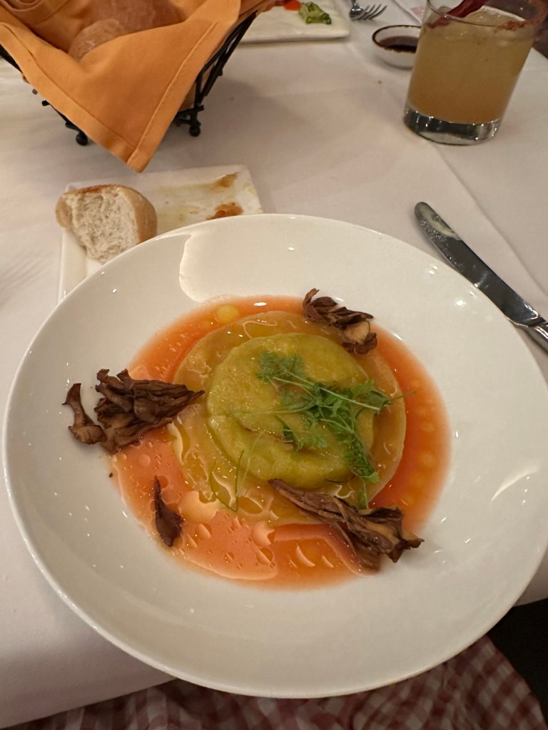 Dinner is a 3-course meal that includes an appetizer, entree, and desert for $89 per adult and $39 per child. The food and service were exquisite! I started with Sonoma Goat Cheese Raviolo which was divine. Charles got the Surf and Turf Roll which he really enjoyed. After our starters our waiter directed us out to the balcony to enjoy the Happily Ever After fireworks. We enjoyed the nighttime display and went back in to delight in the rest of our dinner. For the next course I had the AAA Ahi Tuna, again very tasty and my husband had the Oak-grilled Filet of Beef. We ended the night with Cherry and Dark Chocolate Mille-Feuille and White Chocolate and Vanilla Bean “Mousse”. Everything was delicious and we were both stuffed upon leaving. We also tried the Ancho Rancho Spicy Margarita which was good but a little pricey.