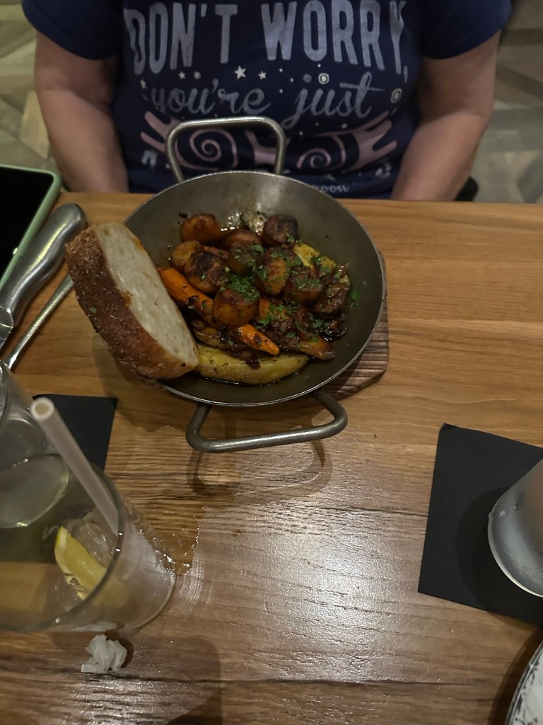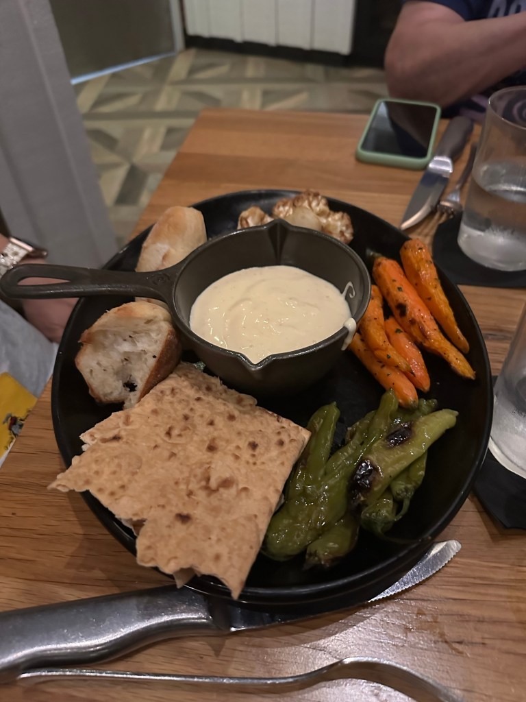 Dinner was good. My sister and I ordered and shared 2 apps, the Bourbon Cheese Fondue and Skillet Roasted Mussels. The mussels were a presentation in themselves, see the video below. They were good but I have had better. The cheese fondue was incredible and came with carrots, cauliflower, peppers, house made crackers, and bread. That cheese though! My daughter had a burger and enjoyed that as well.